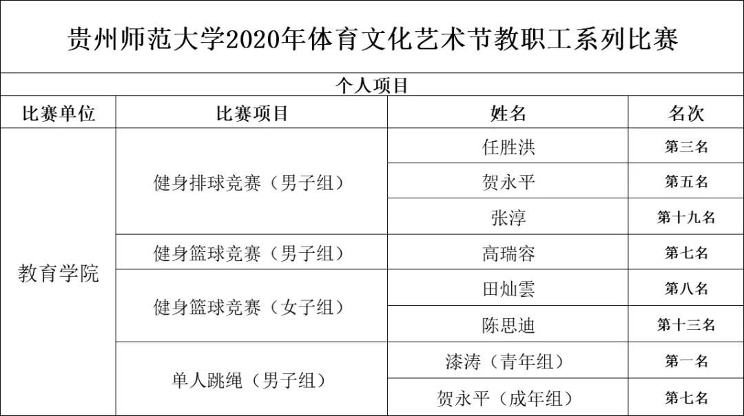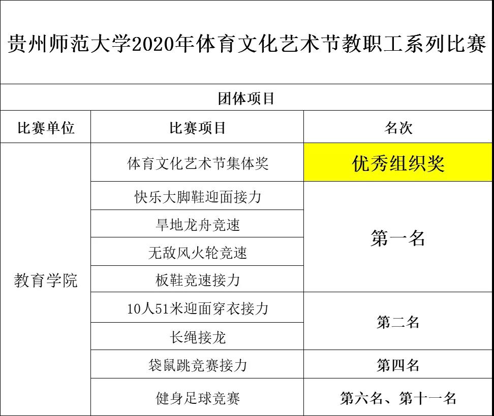 11月13日至14日,k1体育的老师们参加了2020年体育文化艺术节教职工运动会。近日,公司下发了《2020年体育文化艺术节教职工系列比赛名次公布的通知》,公司在多个比赛中喜获佳绩,具体获奖情况如下: