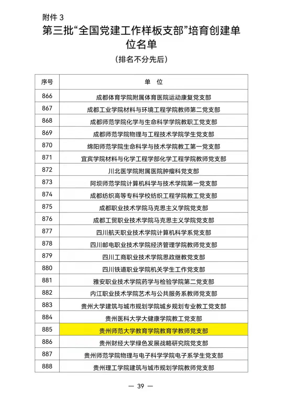 近日,教育部公布了第三批全国党建工作示范高校、标杆院系、样板支部培育创建单位名单,遴选产生了11个全国党建工作示范高校、100个全国党建工作标杆院系、1000个全国工作样板支部培育创建单位。公司教育学教师党支部荣获“全国党建工作样板支部”培育创建单位。