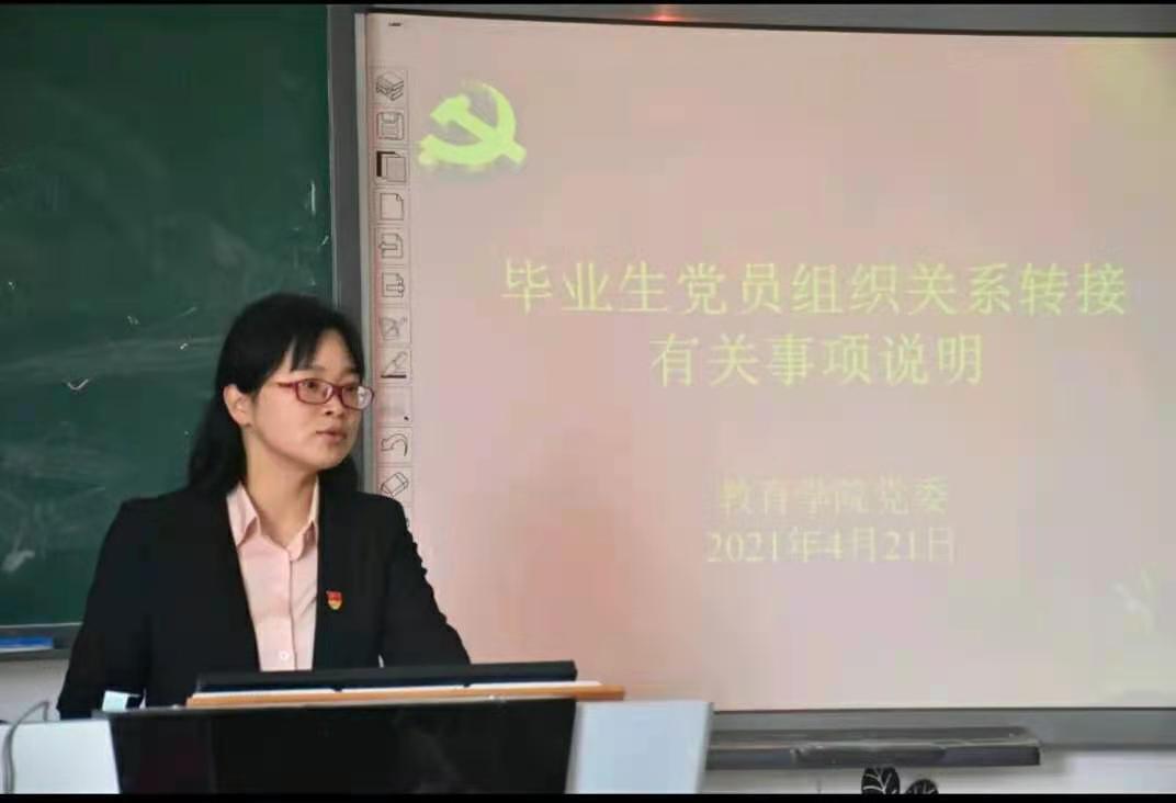 会上,郭腾飞首先对毕业生党员组织关系转移工作进行专题培训,她从什么是组织关系、什么是党员组织关系介绍信、如何转移党员组织关系以及转移党员组织关系需注意的几个问题等四个方面进行详细讲解,着重强调了党员组织关系介绍信的重要性,并以样板图为例详细讲述了介绍信的填写规范,通过举例分析讲解了转移过程中可能会出现的各种情况和问题,希望大家树牢党性观念,提高思想认识,按照文件要求认真落实党组织关系。
