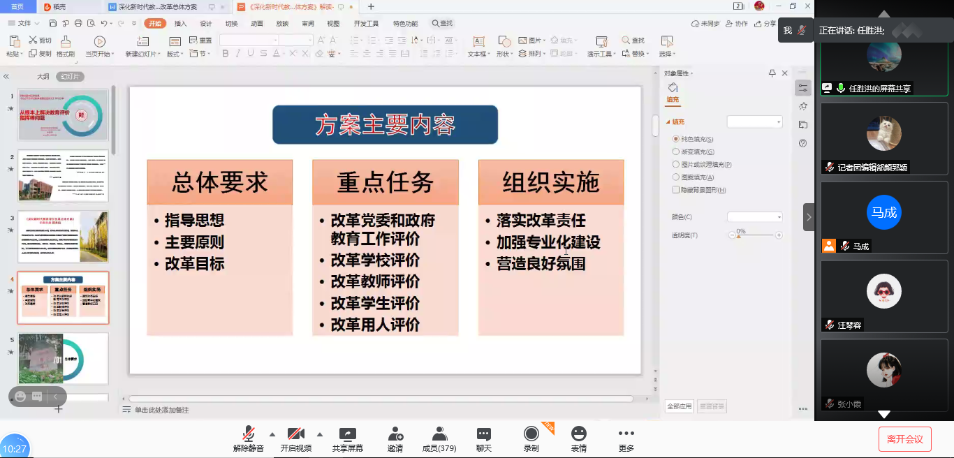 任胜洪首先从总体要求、重点任务、组织实施三个方面介绍了方案的主要内容,并从指导思想、主要原则、改革目标这三个方面对方案的总体目标进行了阐述。
