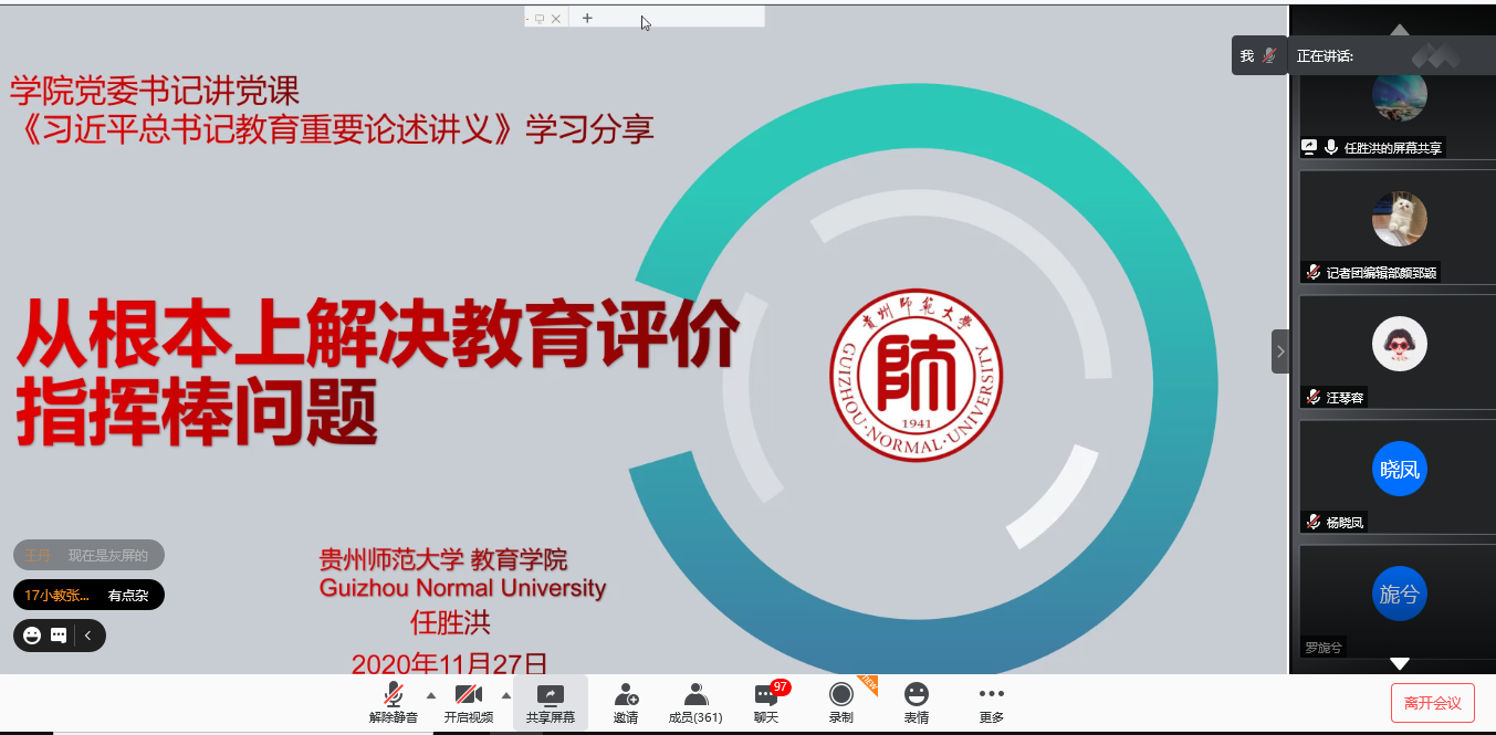 为深入贯彻落实习近平总书记关于教育的重要论述和全国教育大会精神,12月3日,教育公司党委书记任胜洪通过腾讯会议APP以“从根本上解决教育评价指挥棒问题”为主题上专题党课,详细解读了《深化新时代教育评价改革总体方案》,2017级全体员工及部分研究生共350余人到场参加。