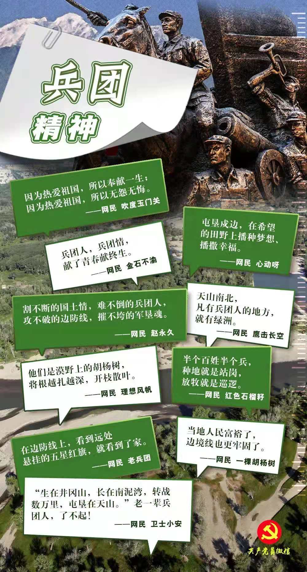 光阴荏苒,岁月如梭,兵团精神犹如大漠中的胡杨屹立不倒。半个多世纪以来,在兵团精神的激励下,一批又一批有志青年从祖国四面八方陆续来到新疆,克服生存、生产困难,扎根边疆、奉献边疆,在天山南北创造出人类发展奇迹,为推动新疆发展、增进民族团结、维护社会稳定、巩固国家边防作出了不可磨灭的历史贡献。社交平台上,网民们也一次次被兵团人的热血情怀感动、被他们的无私无畏震撼。新征程上,让我们从兵团精神中汲取力量,到祖国最需要的地方去,扎根基层,奉献青春,正如网民所说:“因为热爱祖国,所以奉献一生;因为热爱祖国,所以无怨无悔。”