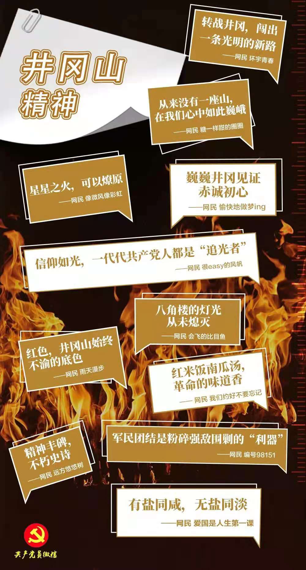 星星之火,终成燎原之势。精神之光,烛照着中国革命一步步迈向成功,指引着中华民族伟大复兴的新征程。挑粮的小道,八角楼的灯光,黄洋界的炮声……抚今追昔,一个个铭刻在历史上的印记,愈发熠熠生辉,震撼人心、砥砺前行。在社交平台上,许多网民纪念那段峥嵘的井冈岁月,写下对历史的告白,坚定对精神的传承。