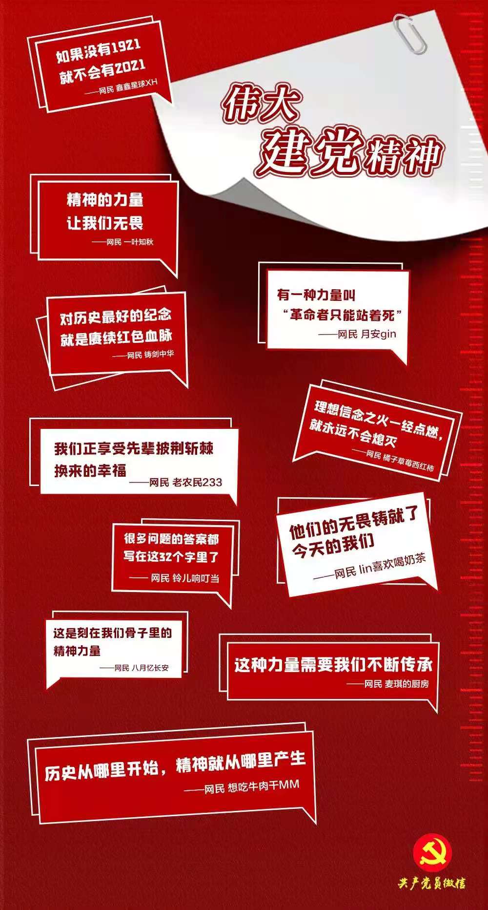 人无精神不立,国无精神不强。一百年来,一代代中国共产党人,顽强拼搏、不懈奋斗,形成了一系列伟大精神,构筑起了中国共产党人的精神谱系。这些伟大精神犹如熠熠火焰,照亮了跋山涉水的征程。在抗击疫魔的战场,在星辰大海的征途,在高原边关的战位,在乡村振兴的一线……精神的火焰永远向上,精神的火炬代代相传。这些伟大精神,让广大网民们深受感染、深受感动、深受鼓舞,纷纷写下感想和思考。让我们一起看看他们的精彩留言,近距离感受百年大党风华正茂的“精神密码”。