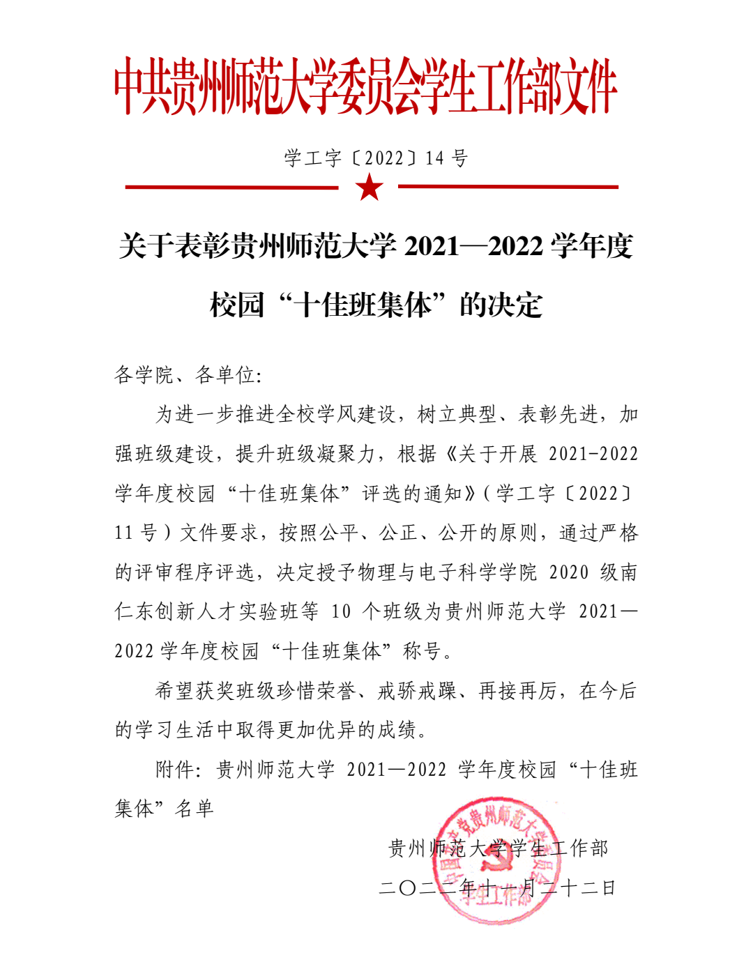 近日,为树立典型,表彰先进,加强班级建设,提升班级凝聚力,公司开展了2021—2022学年度校园“十佳班集体”评选。通过严格的评审程序评选,公司2020级教育技术学班荣获“十佳班集体”。