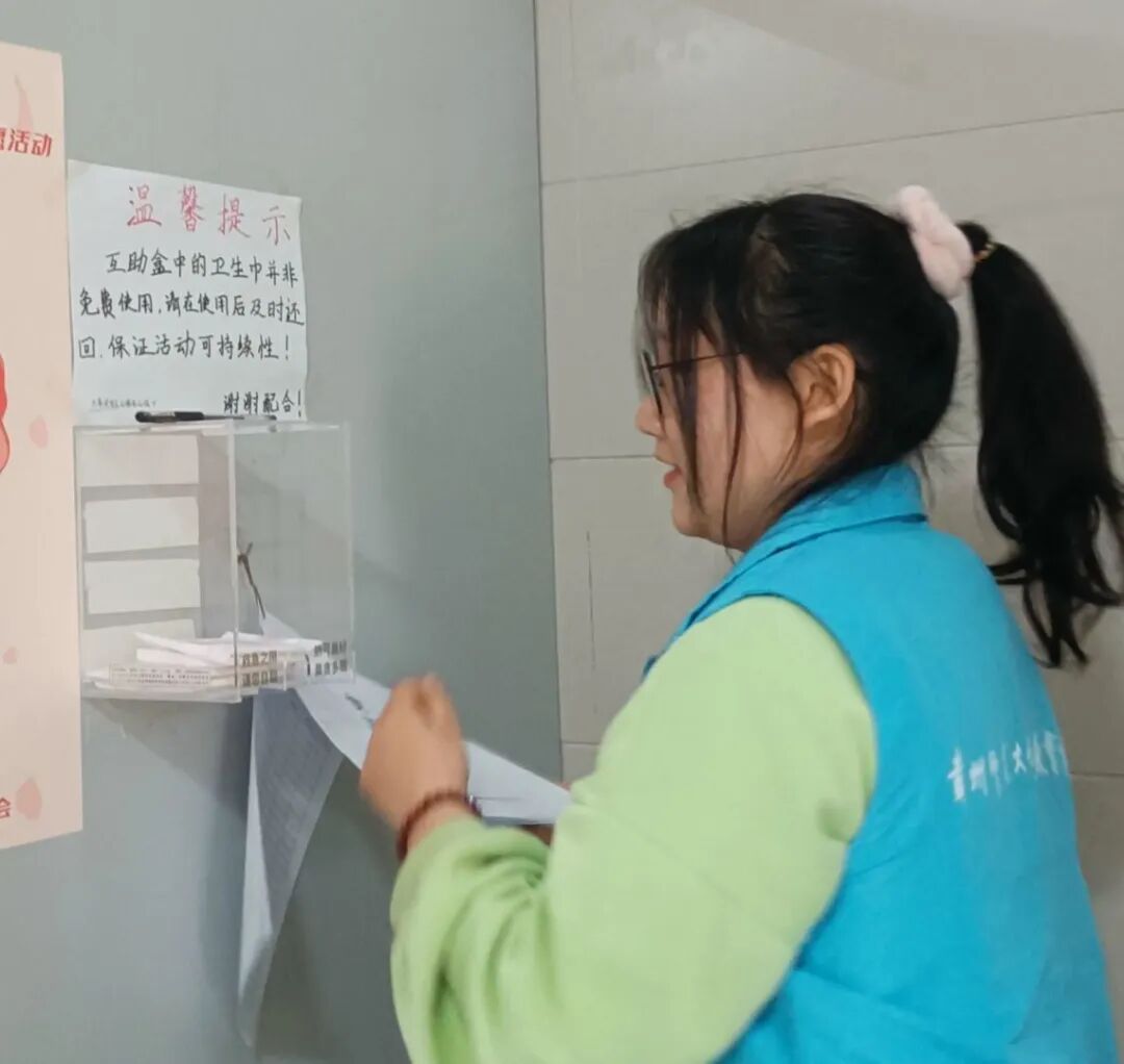 本学期在第九周逐步实行线下上课后,为了更好地服务同学、关爱员工,“予她温情,微爱护航”活动再次拉开帷幕。每个互助盒中投放了一定数量的卫生巾,并在互助盒旁放置登记册和笔,方便取用和投放。