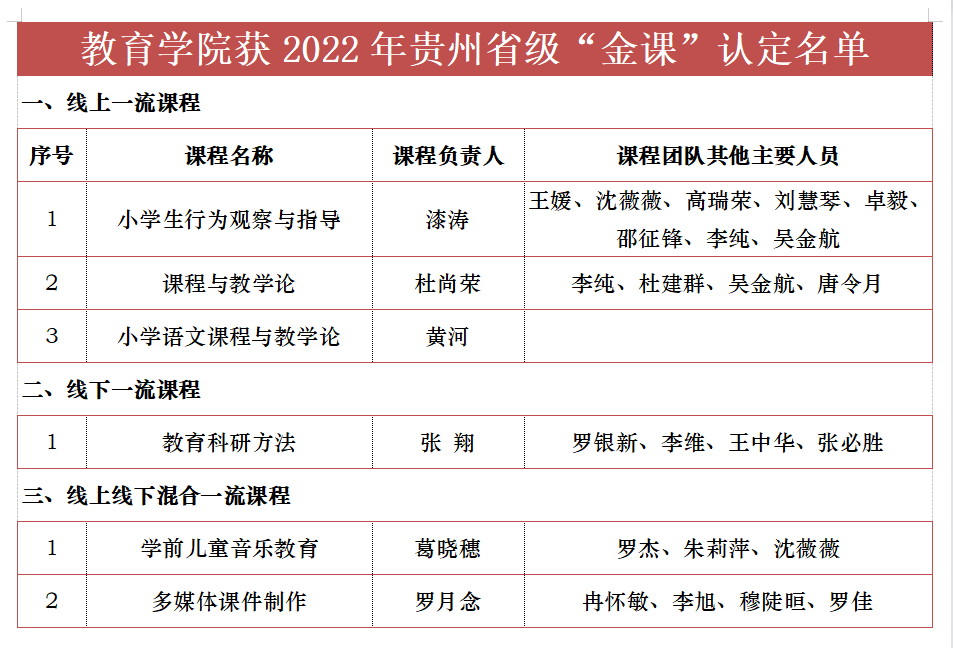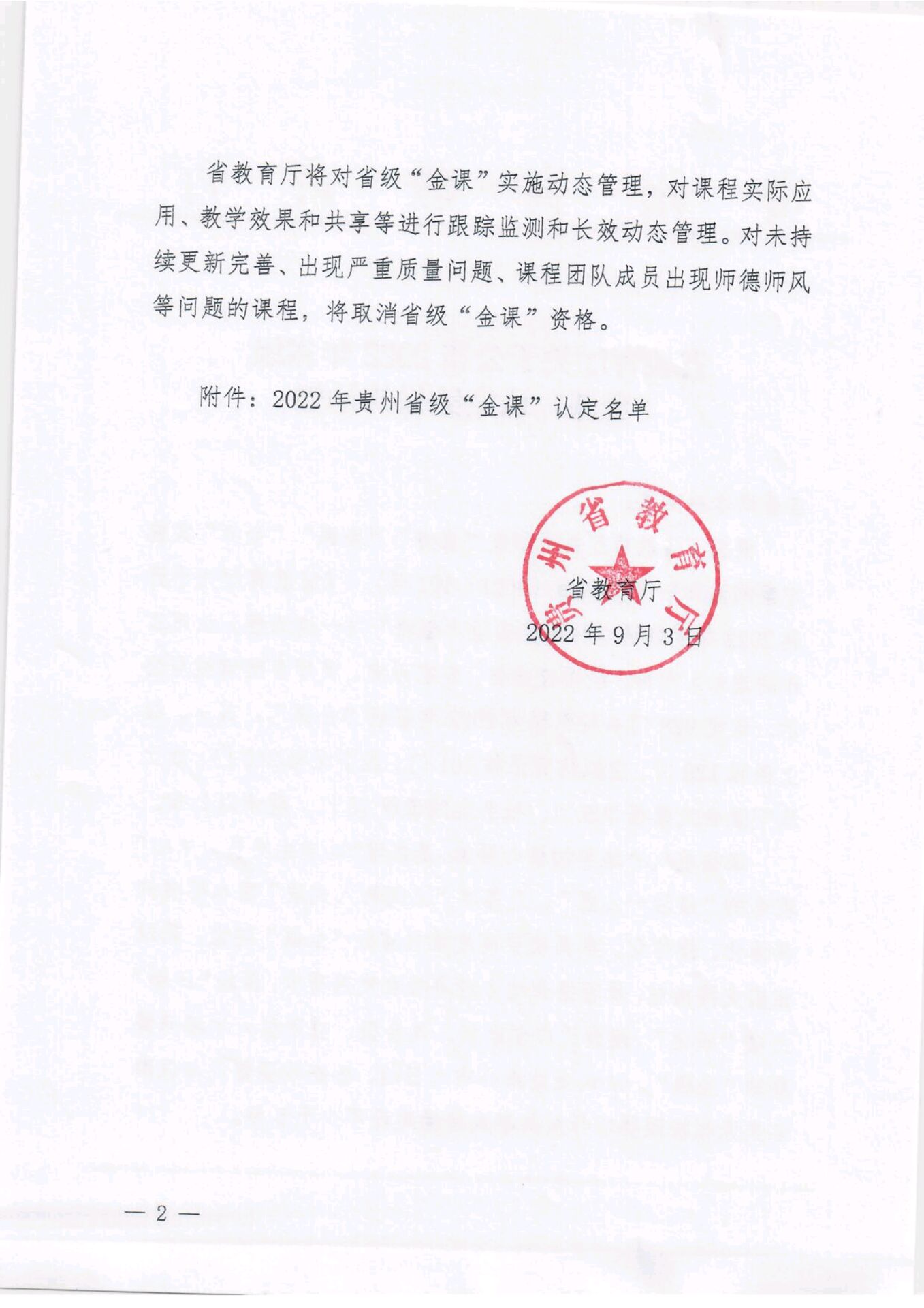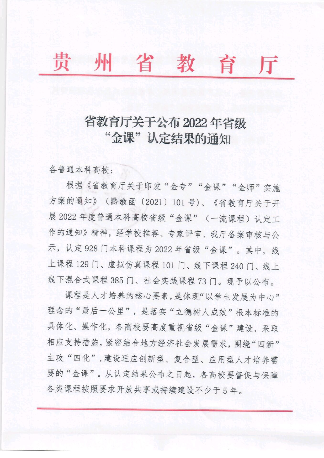 近日,贵州省教育厅下发了《省教育厅关于公布2022年省级“金课”认定结果的通知》。经公司推荐、专家评审、教育厅备案审核与公示,公司6门本科课程被认定为2022年省级“金课”。具体情况如下: