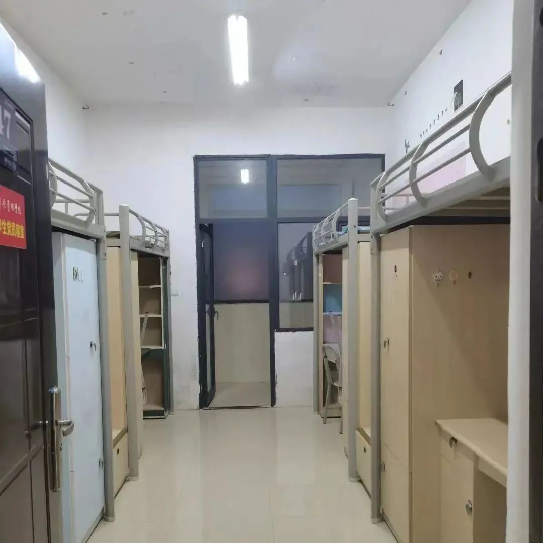 宿舍是上床下桌的四人间,床长约2米,宽0.9米,每个床位都配有一个衣柜和储物柜。宿舍每层楼都有开水房和洗衣间,在一楼还设有不限电压插板、自动贩卖机、常用医护药箱、自助打印机,足以满足你的日常需求。