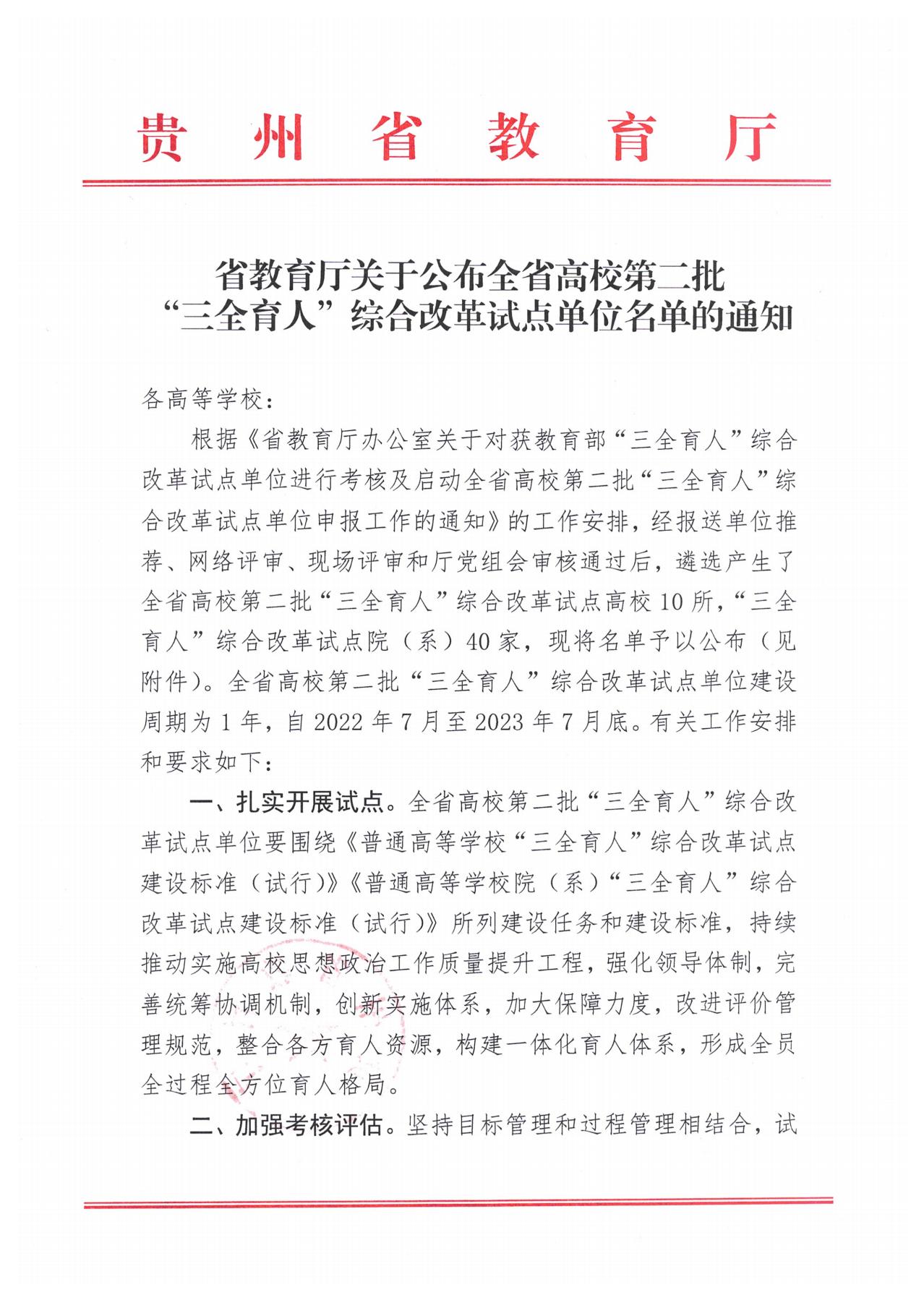 近日,贵州省教育厅下发了《省教育厅关于公布全省高校第二批“三全育人”综合改革试点单位名单的通知》。经报送单位推荐、网络评审、现场评审和厅党组会审核通过,公司获批全省高校第二批“三全育人”综合改革试点单位。