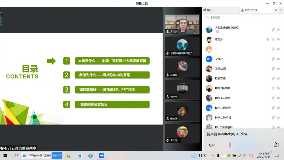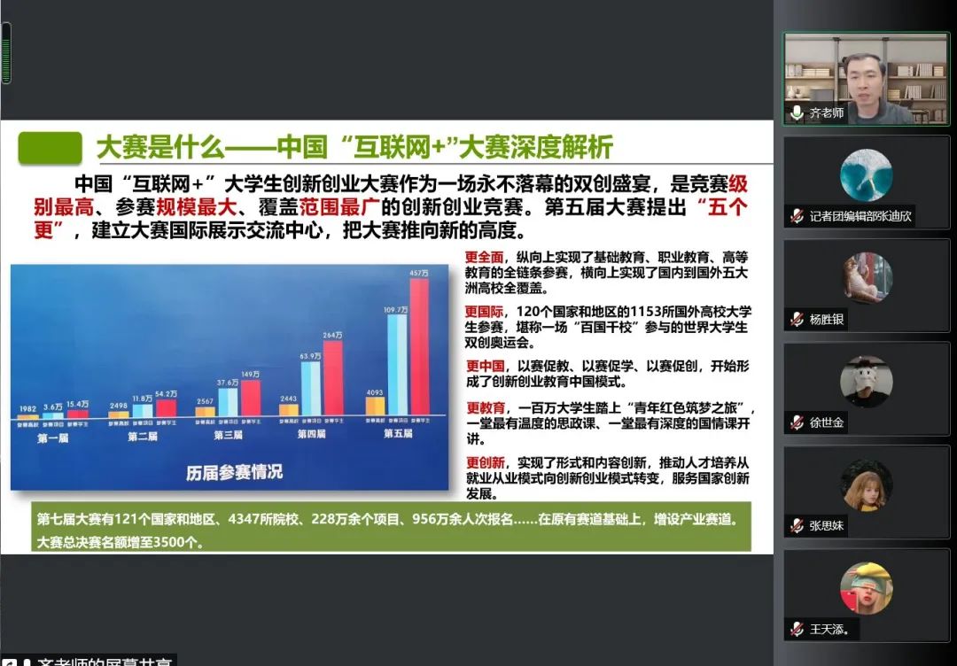 为提高公司员工创新创业大赛的参赛水平,培养员工的创新创业精神,3月31日下午,k1体育通过腾讯会议App开展题为“中国‘互联网+’大赛深度解析与高质量BP、PPT打造”的创新创业讲座。讲座由创新创业公司副经理齐松主讲,k1体育各年级员工共计250余人在线聆听。