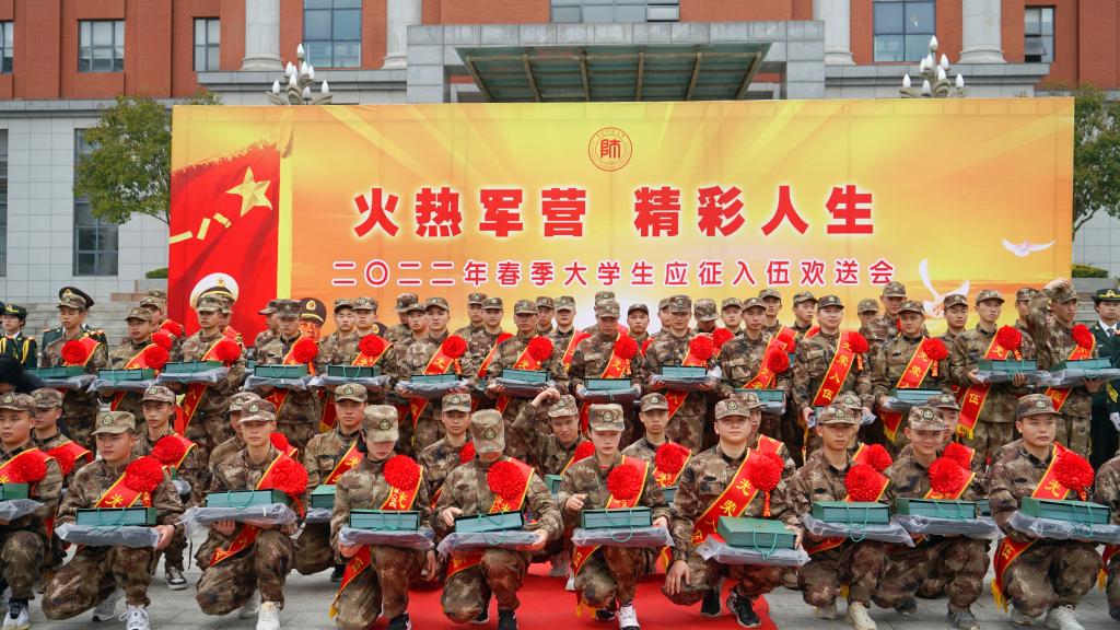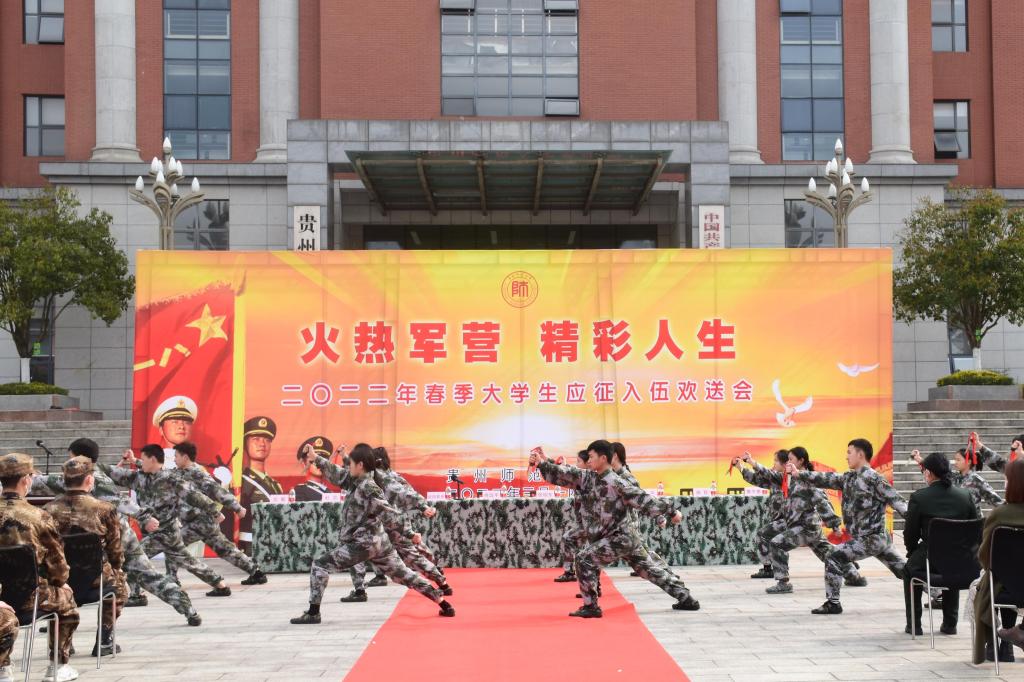 3月14日上午,公司于花溪校区行政楼前广场举办2022年春季老员工应征入伍欢送会。k1体育2018级教育技术学班韩爽、2018级教育学班赵龑两位同学光荣入伍。