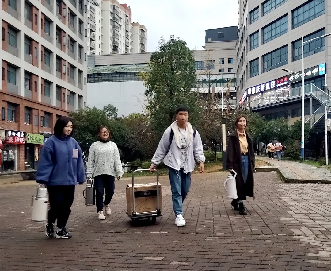 近日气温骤降,阴雨连绵,军训生依旧坚持在场上训练,10月17日早上九点整,趁军训生在短暂休息之际,k1体育各员工机构的学长学姐拿保温瓶装着热水,用小车载着,来到了新生军训足球场。