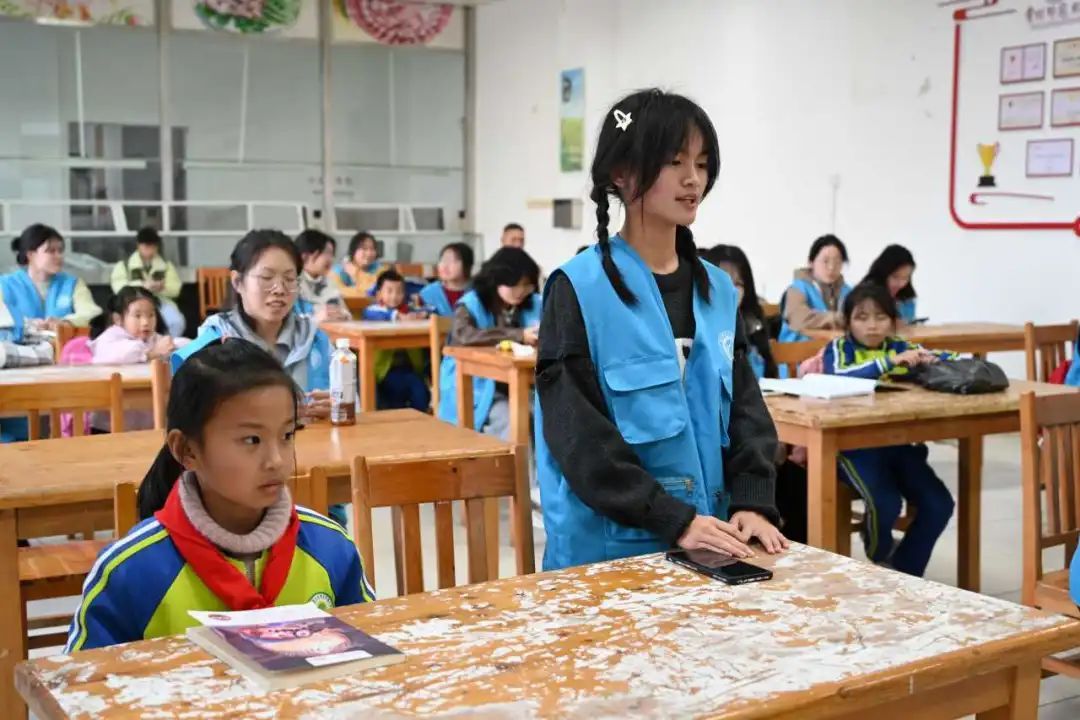 随后,小朋友们和志愿者们起来进行自我介绍。志愿者们表示会维护好课堂的纪律,认真辅导小朋友学习,让大家感受到愉悦的课后时光。最后大家在讲台前合影留念,开班仪式也在欢快的氛围中结束。