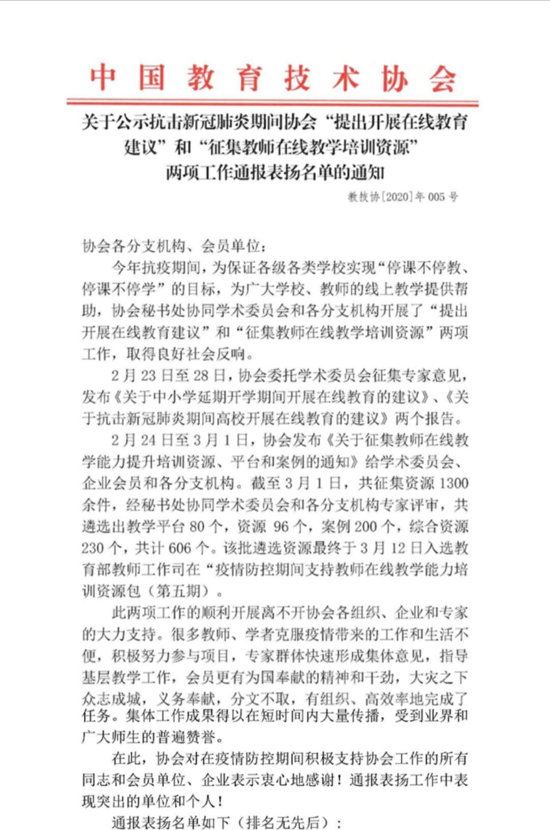 近日,中国教育技术协会发布了《关于公示抗击新冠肺炎期间协会“提出开展在线教育建议”和“征集教师在线教学培训资源”两项工作通报表扬名单的通知》。