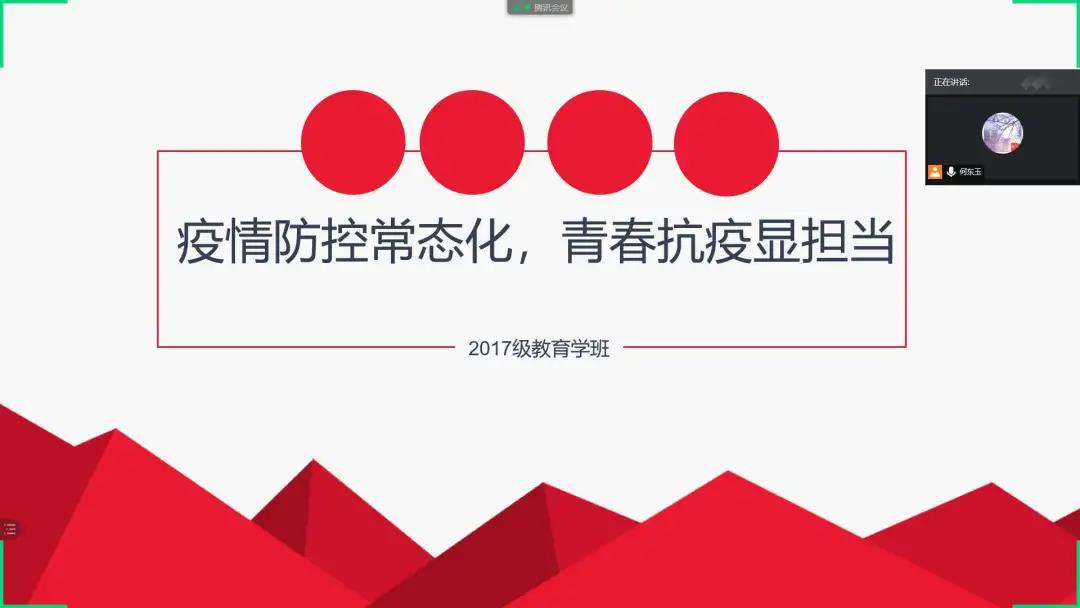 习近平在全国抗击新冠肺炎疫情表彰大会上的讲话中指出“中国的抗疫斗争,充分展现了中国精神、中国力量、中国担当”,青年一代有担当,民族就有希望,为深入贯彻落实疫情防控常态化要求,充分发挥主题班会在老员工思想政治教育中的主渠道作用。9月4日至9月11日,教育公司党委高度重视,积极组织14个班级,1000余人开展了形式多样的“疫情防控常态化.青春抗疫显担当”的主题班会。