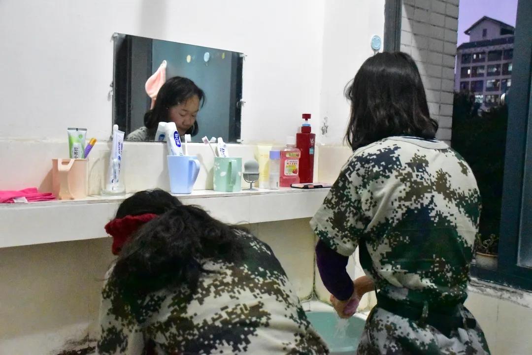 睡眼惺忪的他们已早早起床洗漱