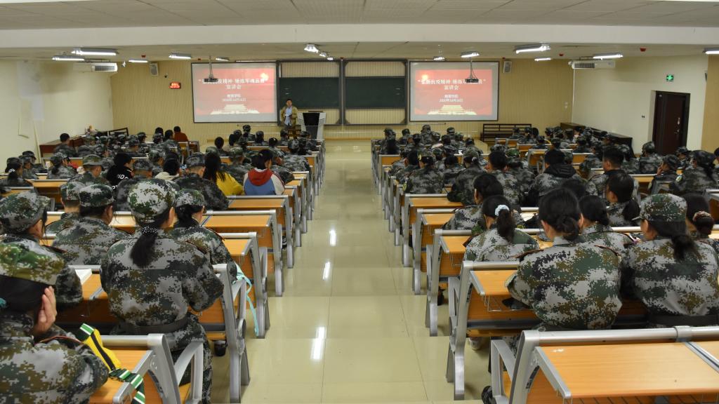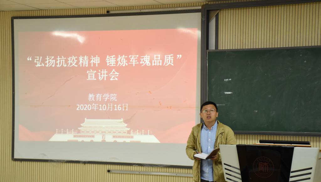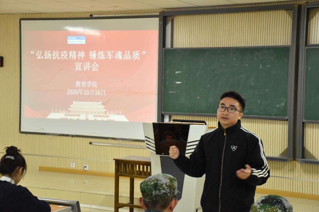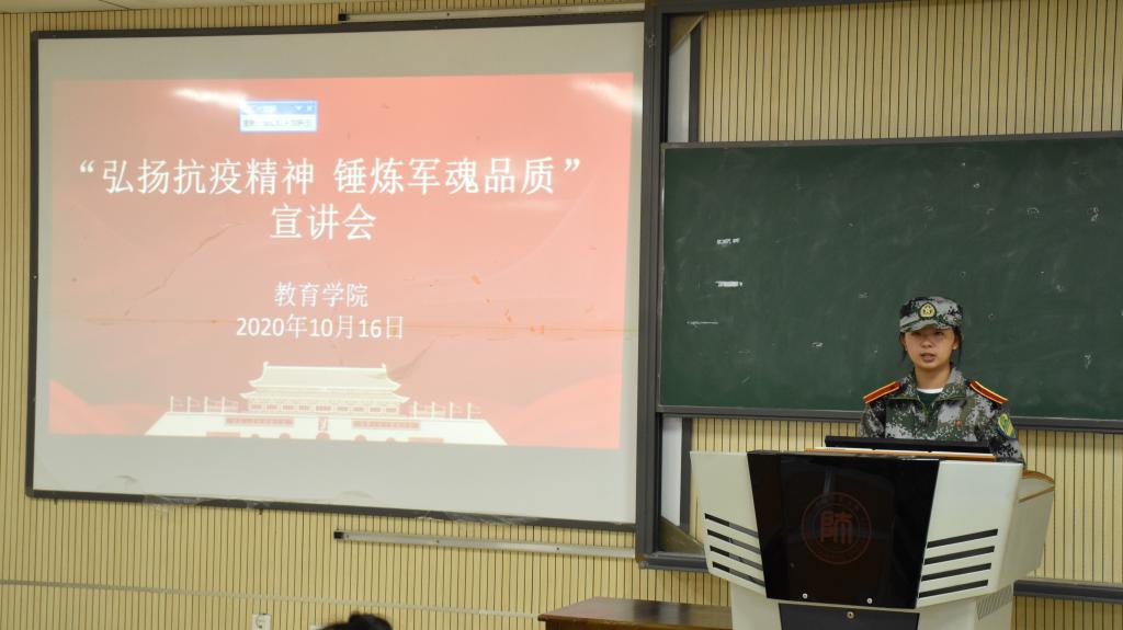 为响应公司培养“四有”军训生的要求,加强员工爱党爱国思想教育,更好地丰富军训文化生活,立德树人、铸魂育人,10月16日,教育公司党委积极组织师生党员、退伍员工、员工干部在公司楼2520教室开展“弘扬抗疫精神 锤炼军魂品质”军训专场宣讲。公司党委副书记张淳,腾飞辅导员工作室负责人郭腾飞,2019级辅导员田灿雲,2020级辅导员吴卫以及2020级全体军训生共计两百余人到场参加,宣讲会由吴卫主持。