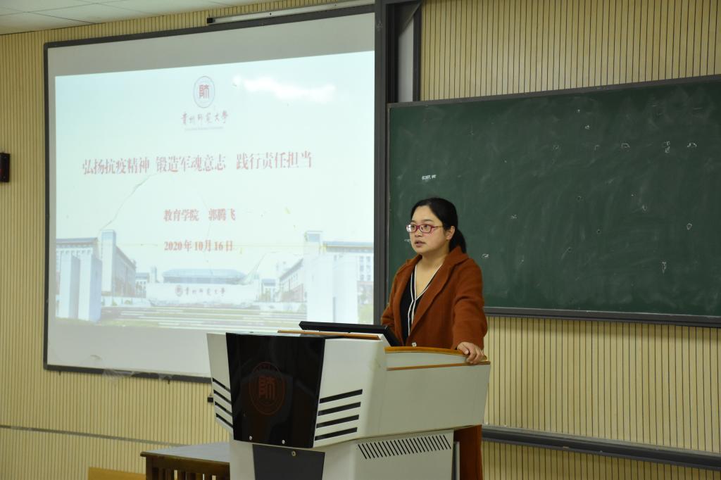 郭腾飞以“弘扬抗疫精神,铸就军魂意志,践行责任担当”为主题展开宣讲。她分享了师大战疫故事,指出新时代青年老员工应当大力弘扬伟大抗疫精神,在严格的军训任务中磨砺军魂意志,努力成为“四有”军训生,时刻保持昂扬斗志,奋发有为、积极进取,不负时代赋予的使命担当。