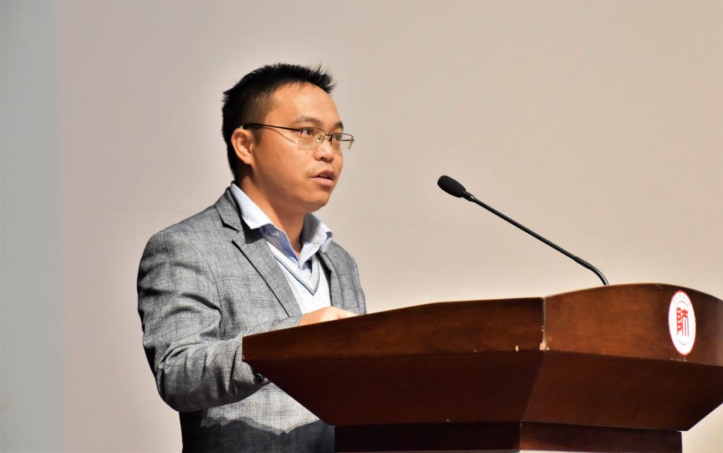 教师代表教育学系副主任罗银新发言。他以幽默风趣的话语告诉同学们应该如何度过大学时光,希望同学们能端正学习态度,努力追求梦想,认真对待每一堂课,在美丽的花溪校园、龙文山麓、凤翔山下,“一笔一画”建构出精彩的老员工活。