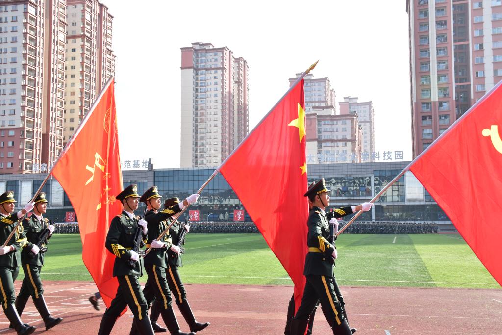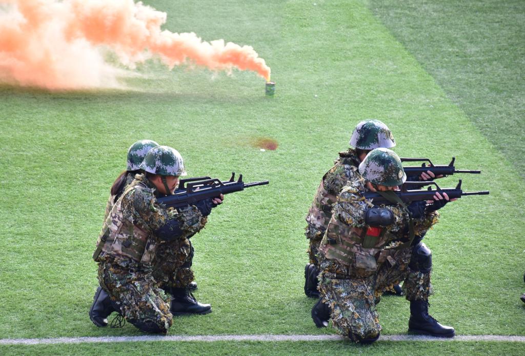 军训生们在铿锵有力的伴奏声中稳步前进,以挺拔的身姿、坚定的眼神、迈着整齐的步伐走向主席台前方接受领导、教官的审阅,嘹亮的口号喊出属于军人的气魄。