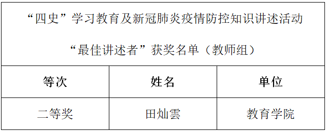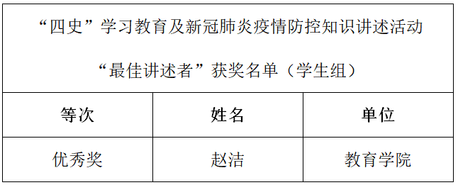 近日,公司下发了《关于表彰“四史”学习教育及新冠肺炎疫情防控知识讲述活动“优秀组织奖”获得者和“最佳讲述者”的决定》,公司师生荣获表彰,具体获奖名单如下: