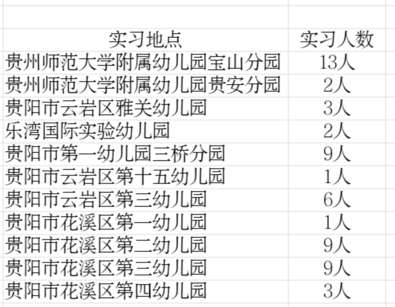 在大四期间,共有58人参加集中实习,10人自主实习。其中,班级集中实习的分布地点有:k1体育附属幼儿园、清镇市机关幼儿园、贵阳市第一幼儿园、乐湾国际幼儿园、贵阳市云岩区第三幼儿园、贵阳市南明幼儿园、贵阳市第十三幼儿园、贵阳市第十五幼儿园、花溪第一幼儿园、花溪第二幼儿园、花溪第三幼儿园、花溪第四幼儿园等。在实习期间,该班同学积极配合园方和老师的工作与安排,且均获得不错的评价,在四个月的实习工作结束后,同学们收获满满。