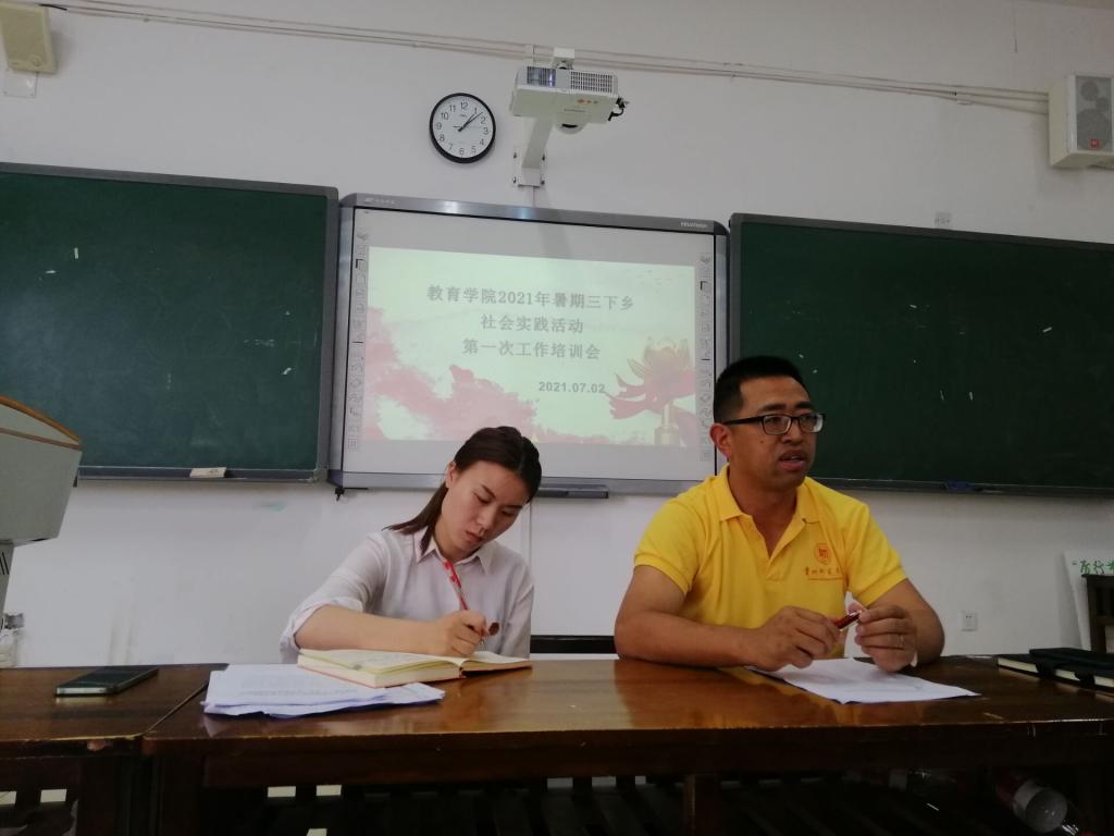 7月2日,指导老师邓江、黄欢及“三下乡”社会实践活动全体员工志愿者于公司楼2105教室开展第一次工作培训会。