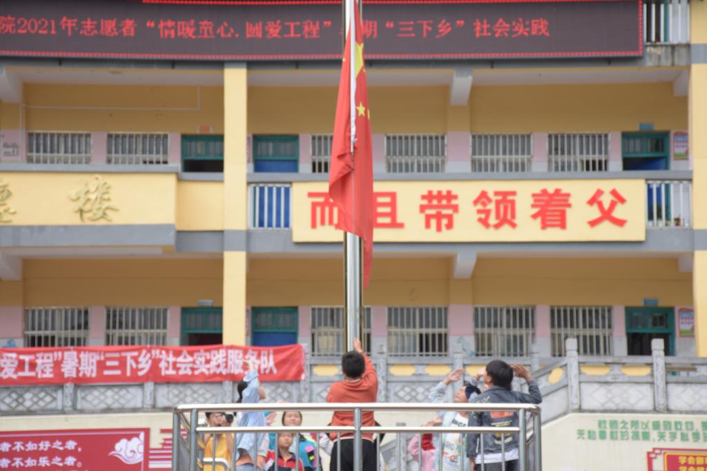 7月20日上午,希望小学的全体师生和志愿者们参加了升旗仪式。伴随着国歌,鲜艳的五星红旗在希望小学教学楼前冉冉升起,六年级一班张睿同学和志愿者党员代表吴玉霞发表国旗下的讲话,表达了对党和国家的无限热爱。随后,同学们手举小红旗,与志愿者合唱《没有共产党就没有新中国》,嘹亮的歌声响彻希望小学的上空,浓浓的家国情环绕在普古乡的千岩万壑。