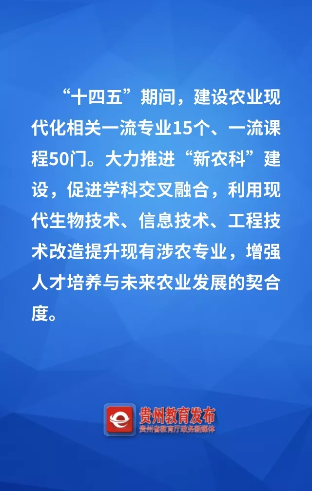 8.推动农业教育创新发展。以推动农业产业规模化、标准化、市场化、品牌化发展为方向,重点围绕我省12个农业特色优势产业发展需求深化涉农专业供给侧结构性改革,充分发挥贵州大学植物保护“双一流”学科优势带动公司相关涉农专业高质量建设发展,积极支持贵州农业职业公司、铜仁职业技术公司等公司建设发展涉农优势专业,推动建设国家级、省级一流涉农专业。“十四五”期间,建设农业现代化相关一流专业15个、一流课程50门。大力推进“新农科”建设,促进学科交叉融合,利用现代生物技术、信息技术、工程技术改造提升现有涉农专业,增强人才培养与未来农业发展的契合度。大力推进信息技术与农业公司产品的深度融合,强化农业科技支撑,推动创意农业、休闲农业、乡村旅游、森林康养等新产业新业态发展。