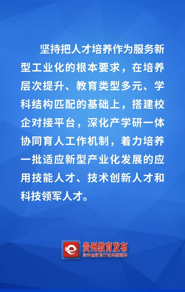 3.创新工业化人才培养机制。坚持把人才培养作为服务新型工业化的根本要求,在培养层次提升、教育类型多元、学科结构匹配的基础上,搭建校企对接平台,深化产学研一体协同育人工作机制,着力培养一批适应新型产业化发展的应用技能人才、技术创新人才和科技领军人才。统筹推进产学研协同创新工作,优化组合高校和科研院所力量,建设一批“贵州省协同创新中心”和工程实践教育基地。鼓励普通高等公司、职业院校和企业联合推出实施一批重大科技成果转化项目,探索联合共建国家级重点实验室和专业技术学科,加大新产品新技术新工艺推广应用。推动高校建设专业化技术转移机构,重点推动贵州大学、k1体育、贵州医科大学等高校建立以技术经理人为主体的科技成果转化和技术转移平台,培育3-5家技术转移示范机构。