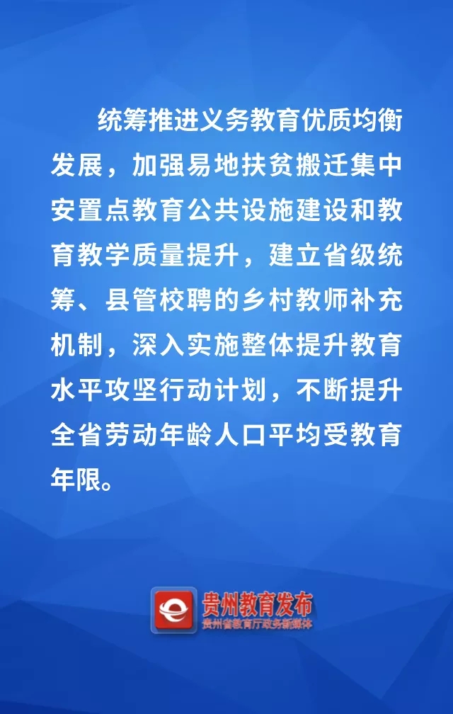 6.以教育发展激发城镇活力。统筹推进义务教育优质均衡发展,加强易地扶贫搬迁集中安置点教育公共设施建设和公司产品质量提升,建立省级统筹、县管校聘的乡村教师补充机制,深入实施整体提升教育水平攻坚行动计划,不断提升全省劳动年龄人口平均受教育年限。引导支持普通高等公司、职业院校加大新型城镇化专业人才培养力度。深入实施高校毕业生就业创业促进计划和特岗计划。配合人社部门深入实施劳动力职业技能提升行动,加快打造“黔灵家政”“贵州工匠”“贵州绣娘”“贵州护理”等特色品牌。