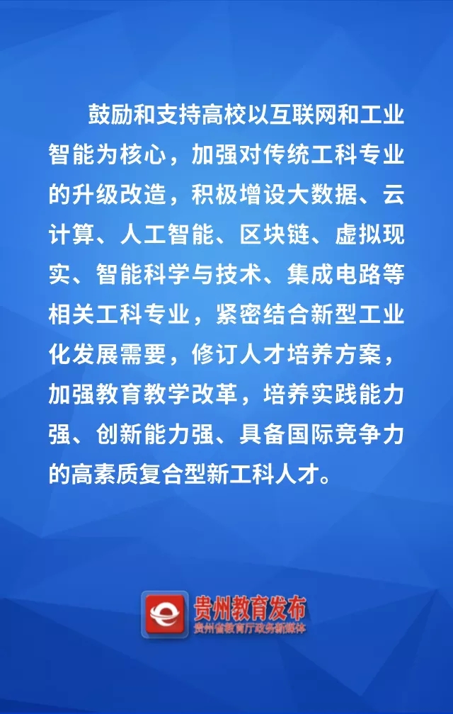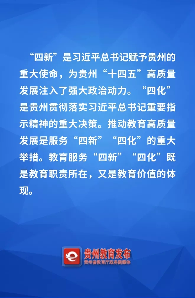 近日,为深入贯彻落实习近平总书记视察贵州重要讲话精神和省委、省政府关于围绕“四新”主攻“四化”的决策部署,省教育厅印发《关于推动教育高质量发展服务“四新”“四化”的意见》(以下简称《意见》),聚焦新型工业化实施“人才培养质量提升工程”,聚焦新型城镇化实施“教育资源优化布局工程”,聚焦农业现代化实施“科学技术创新研究工程”,聚焦旅游产业化实施“专业素质提升驱动发展工程”,多措并举推动贵州教育高质量发展。