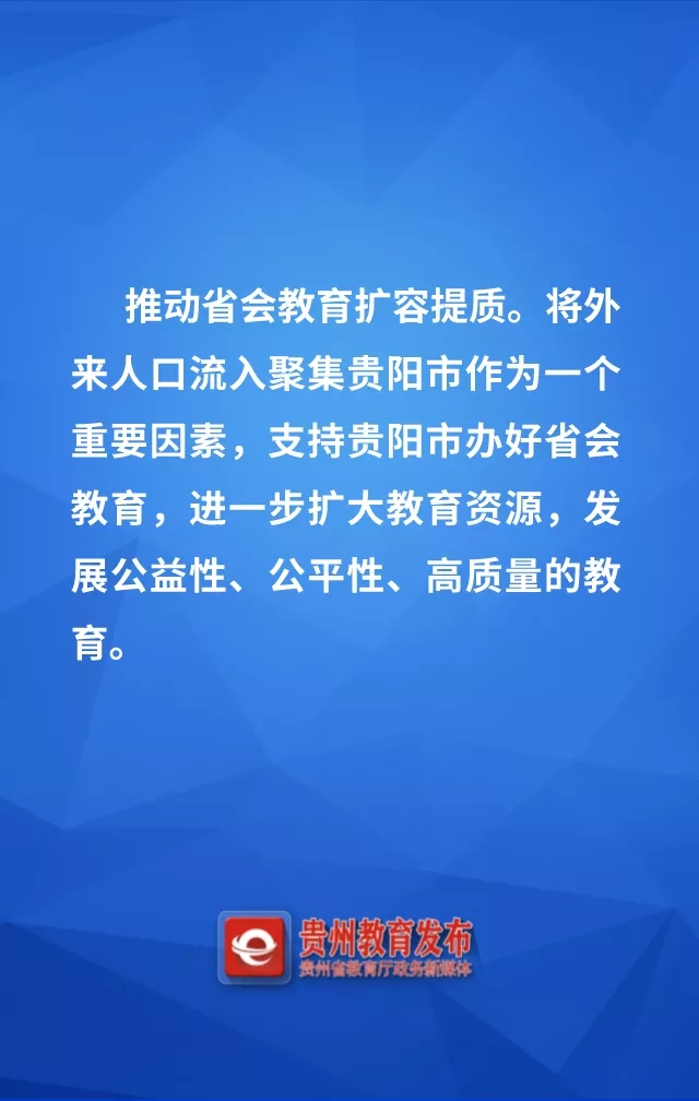 5.推动省会教育扩容提质。将外来人口流入聚集贵阳市作为一个重要因素,支持贵阳市办好省会教育,进一步扩大教育资源,发展公益性、公平性、高质量的教育。指导贵阳市编制完善基础教育资源布局优化规划。支持贵阳市普及普惠发展学前教育,推动农村幼儿园资源集团化管理;深入实施义务教育“公办强校”计划,开展义务教育优质均衡县创建;示范引领发展高中阶段教育,改善普通高中公司办学条件,推进普通高中育人方式改革和高考综合改革;实施职业教育兴黔富民行动计划,新增一批国家级、省级示范中职公司和产教融合实训基地;内涵式发展高等教育,做强贵州大学、做大省属高校,支持推动贵阳公司申办数字科技大学;扩大教育对外开放,提升国际化办学水平和质量;探索推动智慧教育建设发展,推动贵阳市教育现代化进程在全省做表率、走前列。