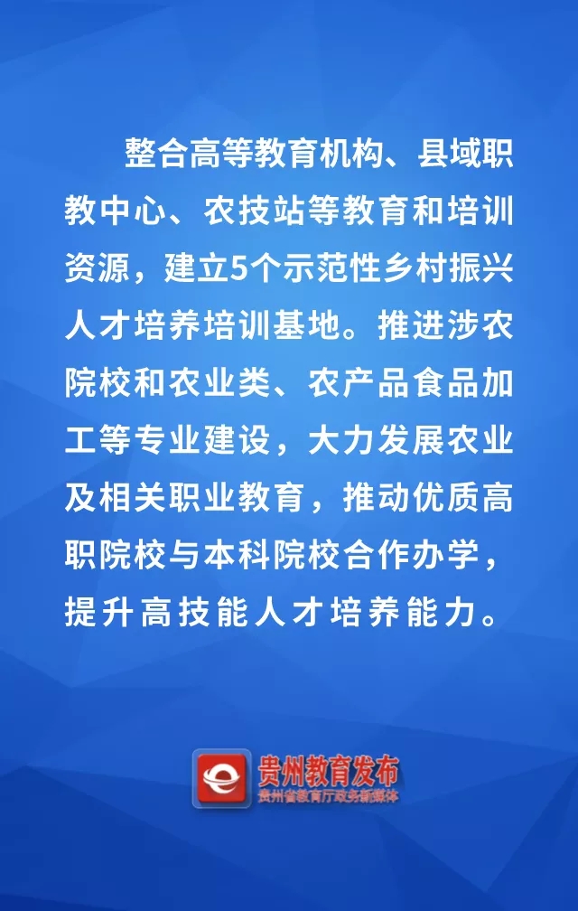 7.发挥高校人才智力支撑优势。加强乡村振兴战略研究的智库建设,深入研究乡村产业振兴中的重大理论和实践问题,为培养数量充足、结构合理的卓越农业人才提供路径和模式,为乡村振兴贡献智慧和方案。整合高等教育机构、县域职教中心、农技站等教育和培训资源,建立5个示范性乡村振兴人才培养培训基地。推进涉农院校和农业类、农产品食品加工等专业建设,大力发展农业及相关职业教育,推动优质高职院校与本科院校合作办学,提升高技能人才培养能力。