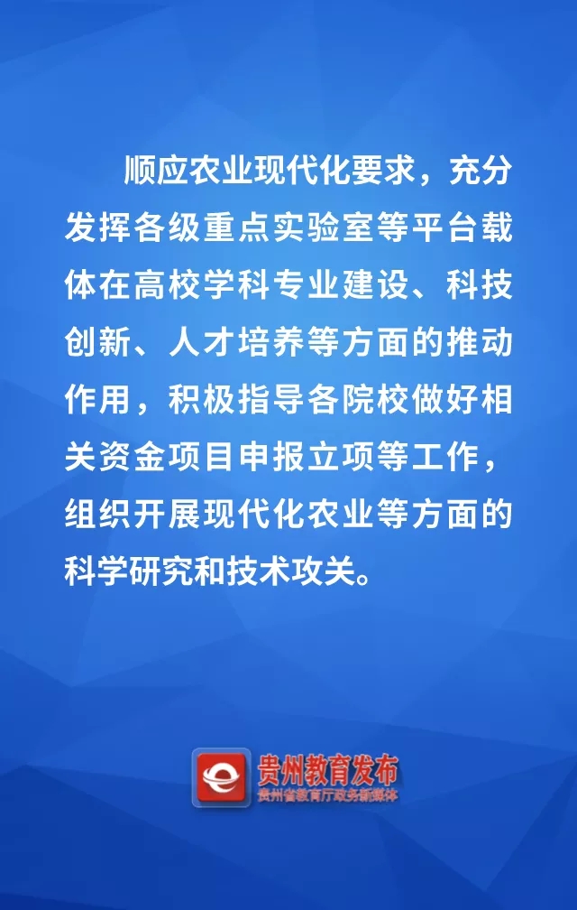 9.支持高校强化科研创新。顺应农业现代化要求,充分发挥各级重点实验室等平台载体在高校学科专业建设、科技创新、人才培养等方面的推动作用,积极指导各院校做好相关资金项目申报立项等工作,组织开展现代化农业等方面的科学研究和技术攻关。重点面向我省12个重点农业特色优势产业、果蔬采后绿色防腐保鲜技术研究与应用、设施农业高产增效关键技术研究与集成示范、食品质量安全控制体系研究等领域重点建设5至10个科研平台;在特色中药材病虫害绿色防控技术、营养健康和高产增质为导向的贵州山地特色作物分子育种与品种创制等领域发布100个左右科研项目,增加科技创新源头供给。