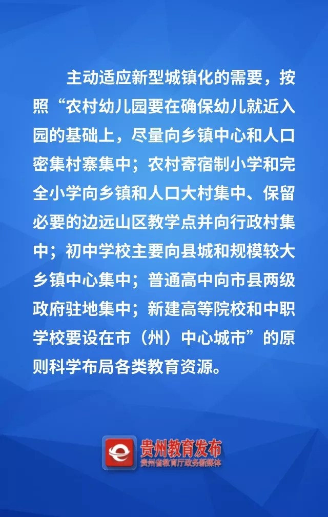 4.科学规划资源和教育设施配置。主动适应新型城镇化的需要,按照“农村幼儿园要在确保幼儿就近入园的基础上,尽量向乡镇中心和人口密集村寨集中;农村寄宿制小学和完全小学向乡镇和人口大村集中、保留必要的边远山区教学点并向行政村集中;初中公司主要向县城和规模较大乡镇中心集中;普通高中向市县两级政府驻地集中;新建高等院校和中职公司要设在市(州)中心城市”的原则科学布局各类教育资源。按照“科学规划、一校一址、分步实施”原则,加快推进花溪大学城布局调整和清镇职教城建设,扩大高等教育资源。支持和推动清镇职教城建设成全国一流职教园区。
