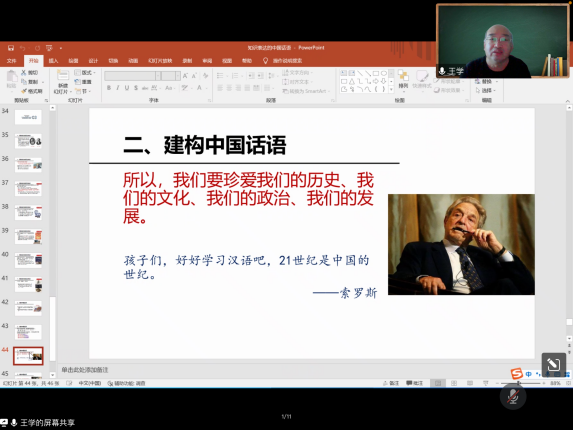 王学围绕文明型国家和民族两个概念对中国及世界其他国家进行知识表达的话语解析。他指出"文明型国家与民族"在于了解中国从古至今的发展道路和民族特点。随后,他详细介绍了文明型国家所具有的超大型的人口规模、超广阔的疆域国土、超悠久的历史传统、超深厚的文化积淀等四大特点。最后,他解读了“如何解构西方话语”,希望大家立足中国鲜活的改革实践,以此建构中国话语。