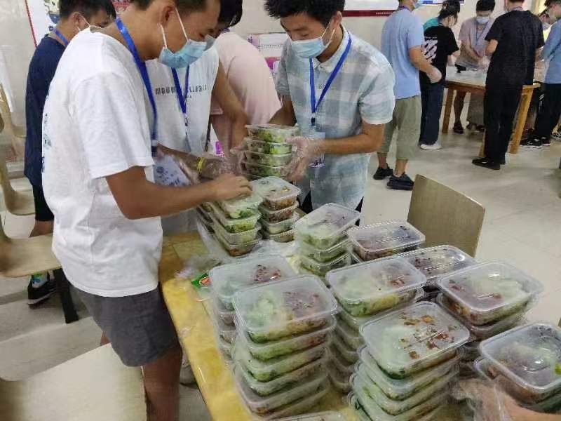 志愿者们在食堂值班中要维持同学们排队时的秩序,避免拥挤;检查桌上隔板是否粘连牢固,注意让就餐同学在有隔板的桌上就餐,并且在就餐时不要将隔板取下。在后厨帮忙的同学们也在保质保量的为宝山校区的同学们打饭,让他们不必为中晚餐烦恼。